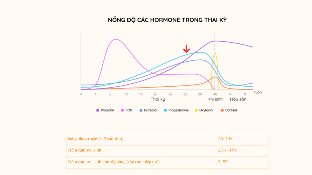 Trong 24 giờ đầu tiên, nồng độ estrogen và progesterone – vốn đạt đỉnh trong thai kỳ – giảm nhanh. Sự thay đổi này kích hoạt quá trình tiết sữa, đồng thời cũng ảnh hưởng rõ rệt đến cảm xúc, bao gồm “baby blues” mà phần lớn các bà mẹ trải qua trong tuần đầu tiên.